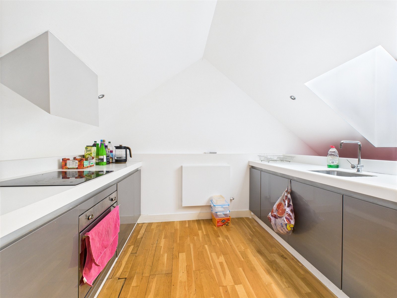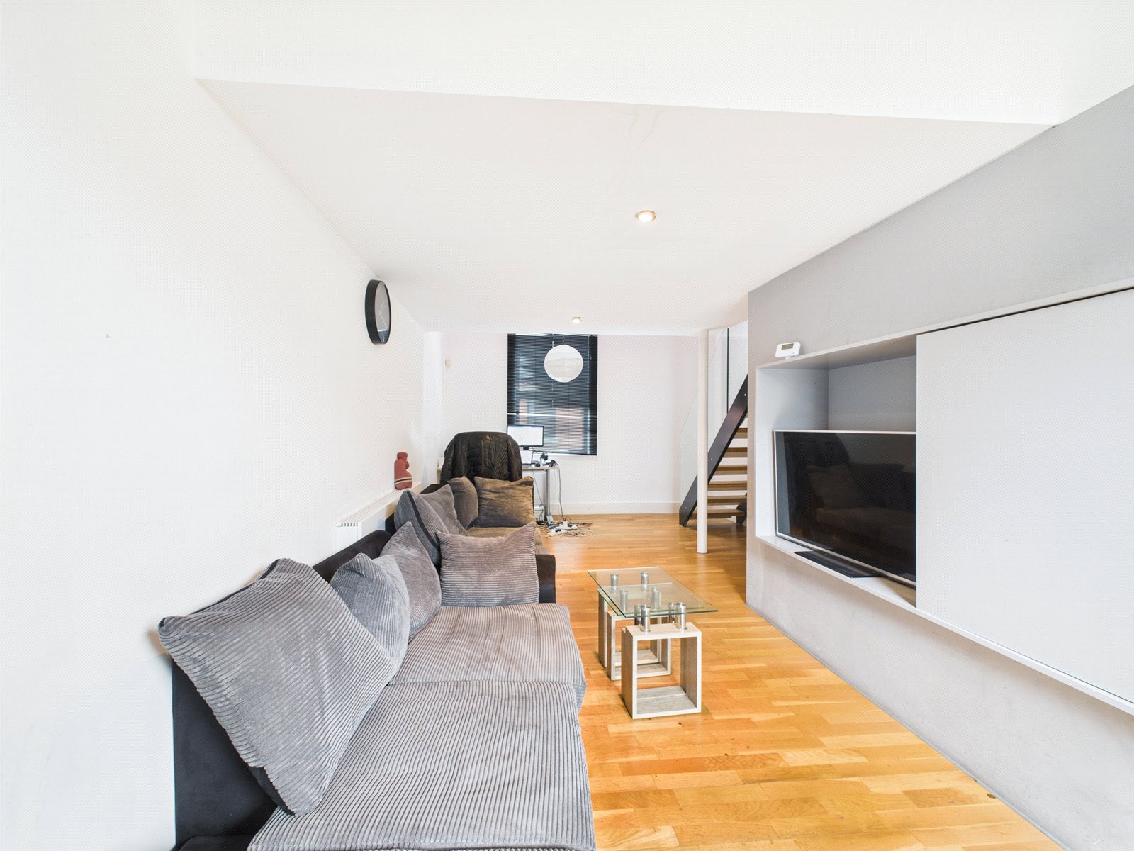 The property briefly comprises of entrance hallway, two double bedrooms, the master bedroom features a light box that brings natural light in, and a bathroom with an unique sunken bath with shower overhead. A large open plan living/dining area with sliding doors that lead to an outside terrace. And a fully fitted kitchen to the top floor.