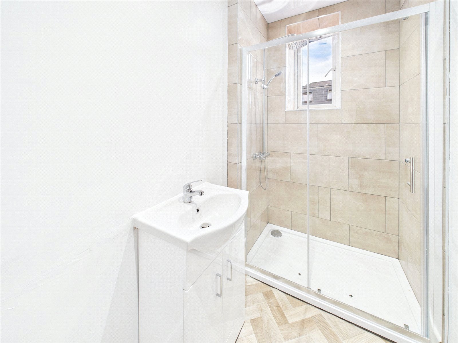 uPVC double glazed window to side elevation, linoleum flooring, ceiling light point, shower cubicle with dual head thermostatic mixer shower and cabinet mounted hand wash basin.