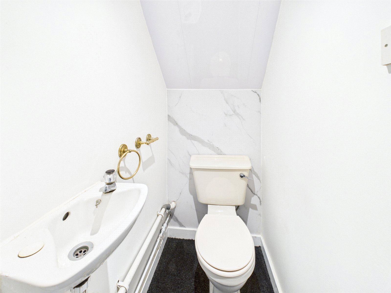 uPVC double glazed window to side elevation, linoleum flooring, ceiling light point, low level wc and hand wash basin.