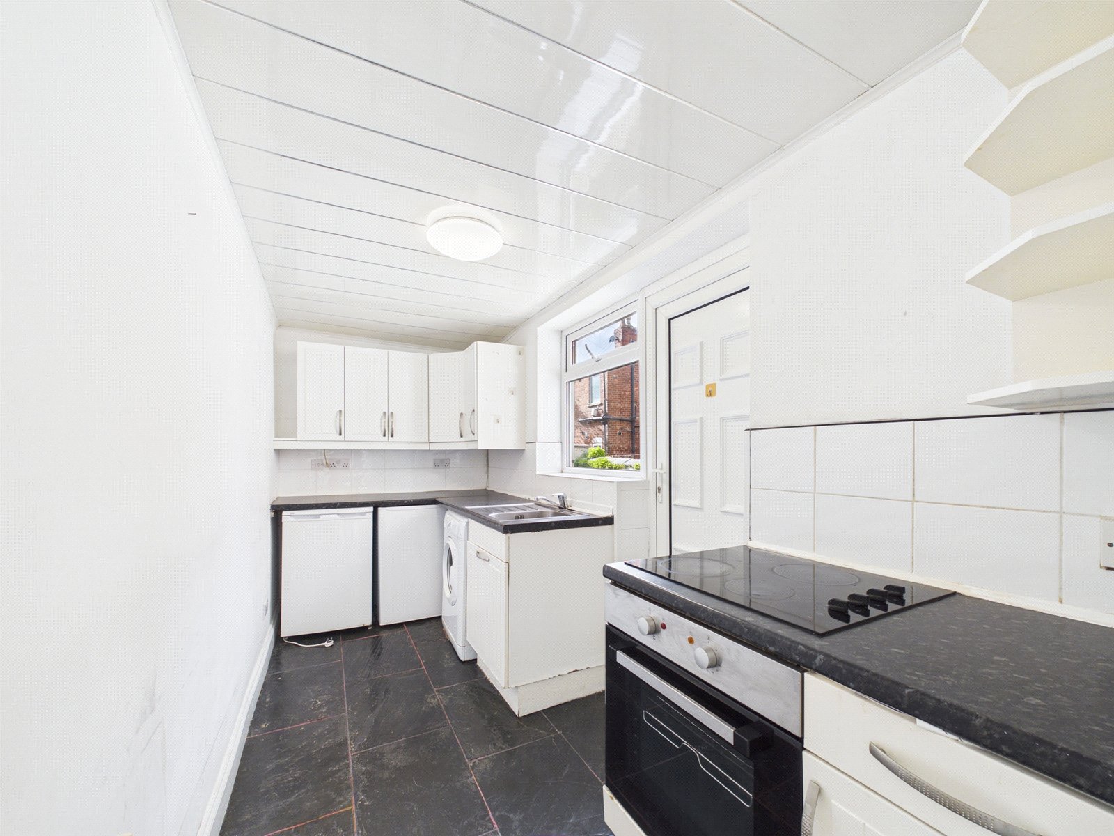 uPVC double glazed window and door to side elevation, tiled flooring, radiator, ceiling light point, a range of base and wall units with roll top work-surface and tiled splash back, stainles steel sink with drainer and mixer tap, four ring halogen hob and integrated electric oven.