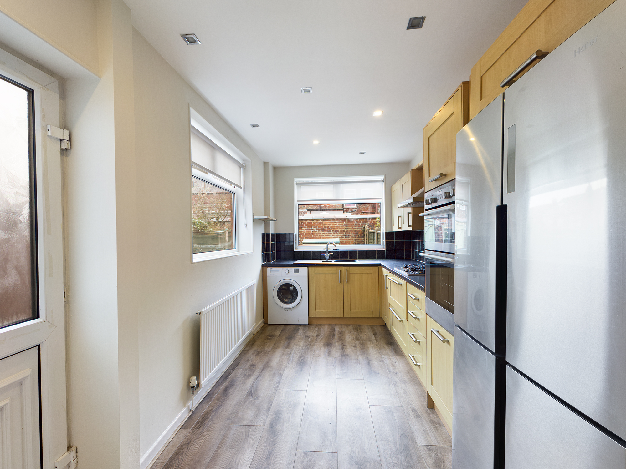 uPVC double glazed windows to side and rear elevations, door leading to rear garden, laminate flooring, radiator, recessed spot lights, a range of base and wall units with roll top work-surface, stainless steel sink and drainer with mixer tap, four ring gas hob, double electric oven, American style fridge/freezer and washing machine.