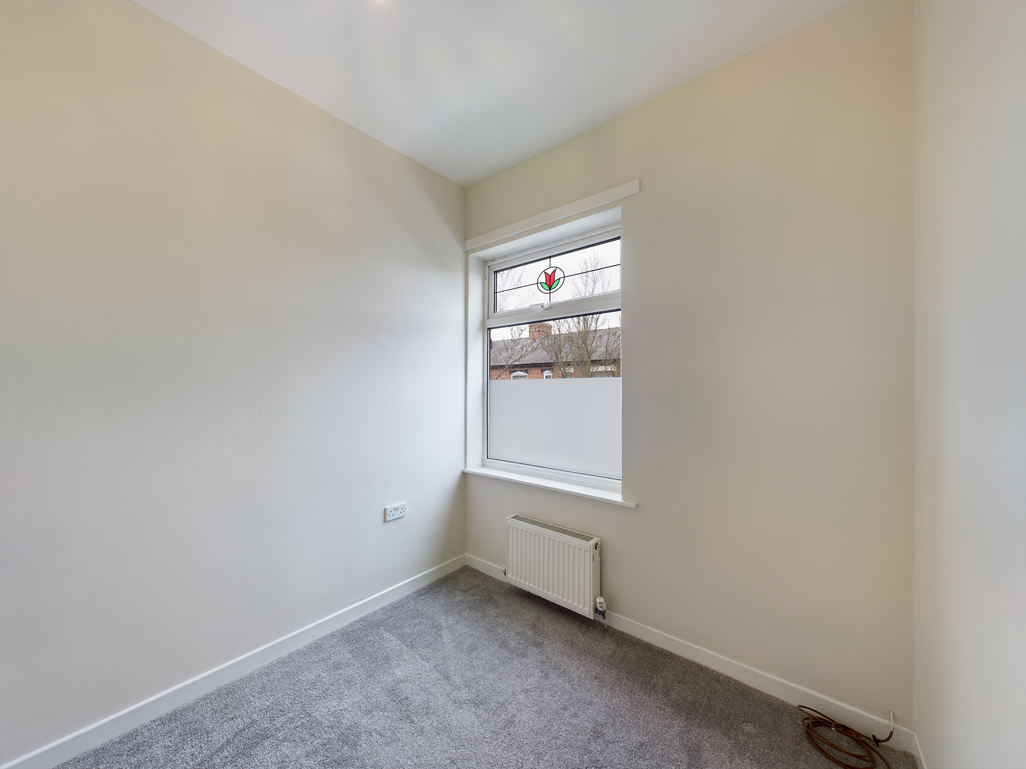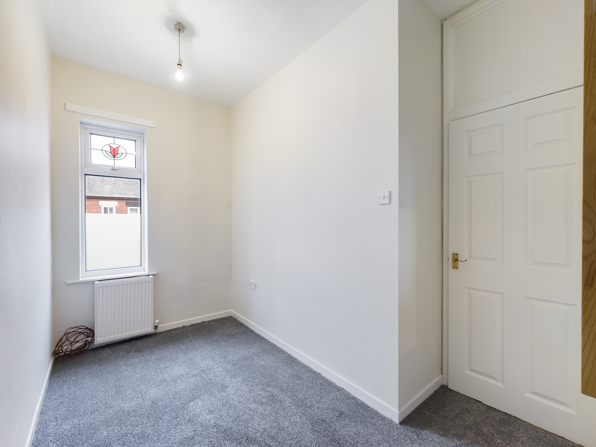 uPVC double glazed window to rear elevation, carpet, radiator, ceiling light point and store cupboard.