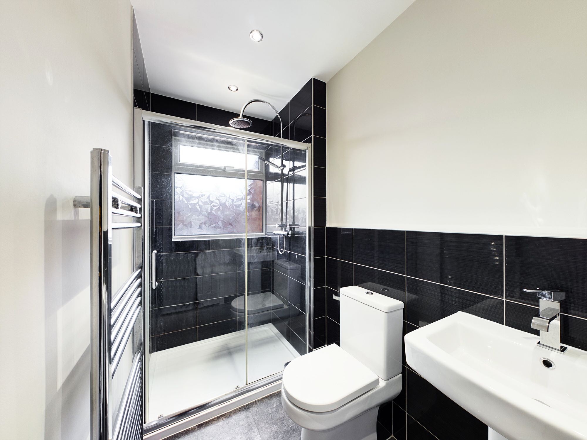 uPVC double glazed window to rear elevation, wall mounted chrome heated towel rail, ceiling recessed spot lights, tiled flooring, white three piece bathroom suite comprising of low level wc, pedestal hand wash basin and large shower cubicle with thermostatic mixer shower with dual shower heads.