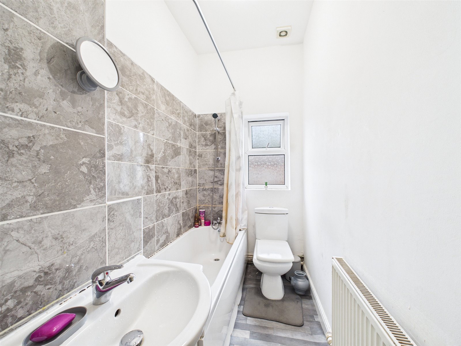 uPVC double glazed window to rear elevation, linoleum flooring, ceiling light point, radiator, white three piece bathroom suite comprising of low level wc, pedestal hand wash basin and panelled bath with shower off taps.