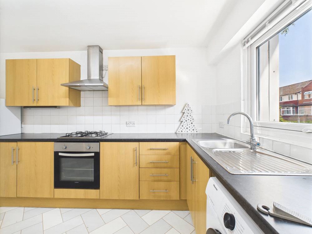 uPVC double glazed window to front elevation, tiled flooring, ceiling light point, radiator, a range of base and wall units with roll top work-surface with tiled splash back, stainless steel sink with drainer and mixer tap, four ring gas hob, integrated electric oven and wall mounted extractor hood.
