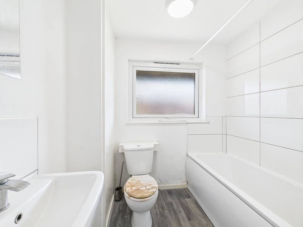 uPVC double glazed window to front elevation, linoleum flooring, ceiling light point, white three piece bathroom suite comprising of low level wc, pedestal hand wash basin and panelled bath with wall mounted thermostatic mixer shower.