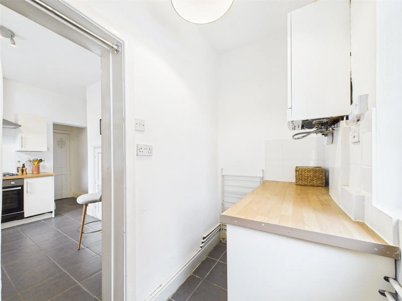 Upvc double glazed window to rear elevation, door to side, tiled flooring, radiator, base units with work-surface and plumbing for washing machine and tumble dryer.