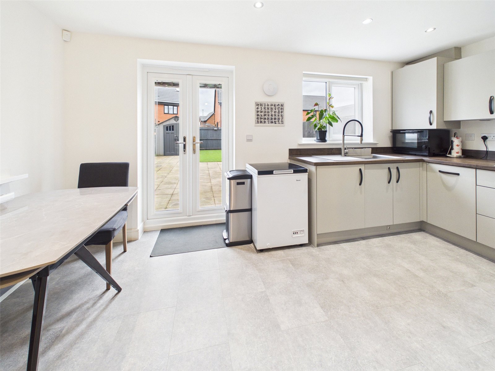 uPVC double glazed window and patio door to rear elevation, vinyl flooring, recessed ceiling spotlights, radiator, a range of base and wall units with roll top work-surface, sink with drainer and mixer tap, four ring gas hob with extractor above, integrated double electric oven and slim line dishwasher.