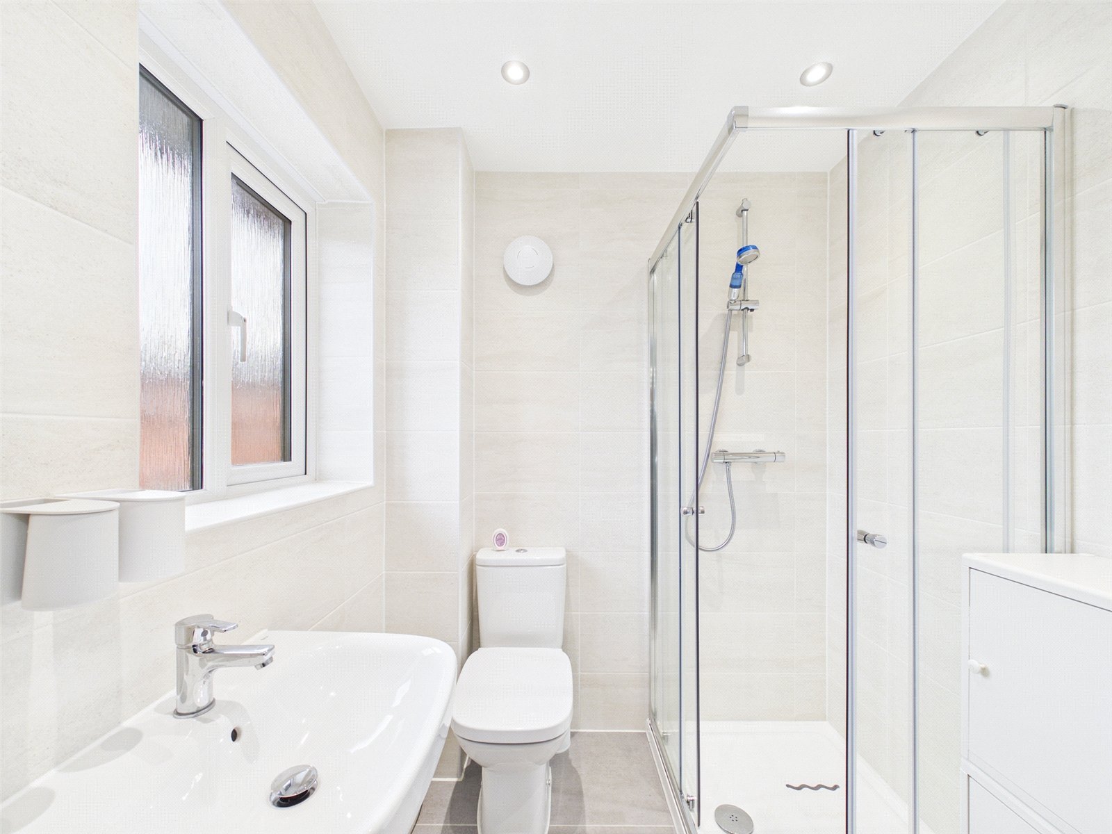 uPVC double glazed window to front elevation, tiled flooring, floor to ceiling tiled walls, recessed ceiling spotlights, chrome heated towel rail, low level wc, pedestal hand wash basin and shower cubicle with thermostatic mixer shower.