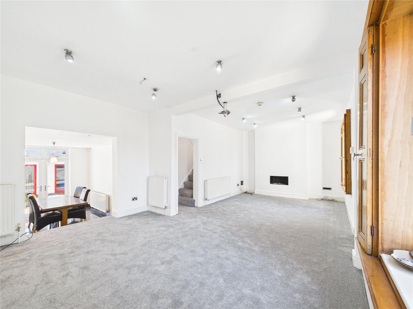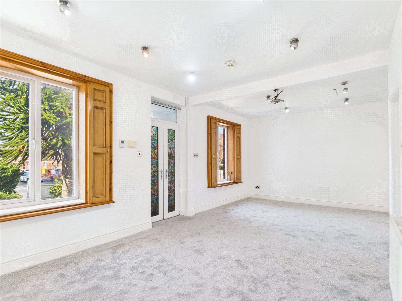 Two large uPVC double glazed windows to front elevation with wooden shutters, carpets, radiators, ceiling spot lights and gas fire.
