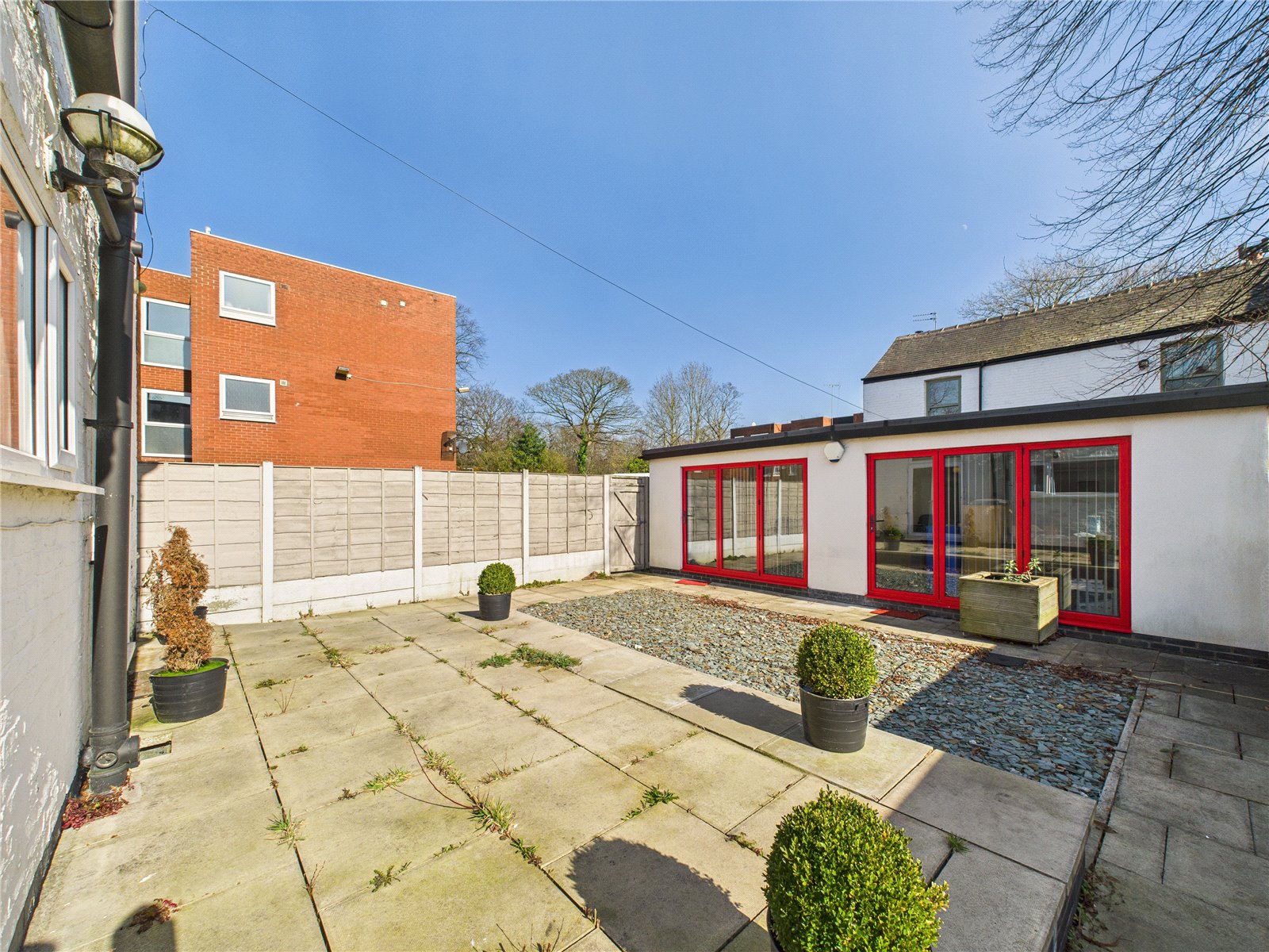 Gated access to front of property with path leading to front door, mature flower beds and trees. Good sized rear garden with raised flag paved patio area.